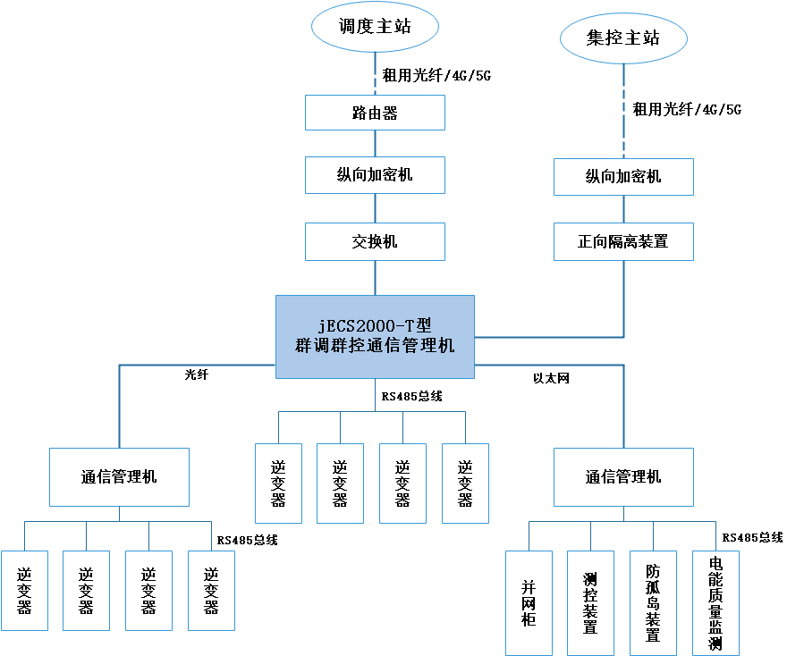jECS2000-T型群調(diào)群控通信管理機(jī)作為光伏發(fā)電站二次設(shè)備中的遠(yuǎn)動(dòng)裝置、通信規(guī)約轉(zhuǎn)換裝置、群調(diào)群控裝置,是光伏電站自動(dòng)化系統(tǒng)的核心部件。具備與調(diào)度或集控中心通信交互、負(fù)責(zé)光伏站各類(lèi)裝置接入及規(guī)約轉(zhuǎn)換、完成光伏并網(wǎng)點(diǎn)數(shù)據(jù)采集、接收并執(zhí)行調(diào)度主站發(fā)送的群調(diào)群控指令等功能。