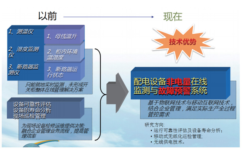 配電設(shè)備非電量在線監(jiān)測與故障預(yù)警系統(tǒng)由傳感器、采集終端、溫濕度控制器、集中通信控制柜和主站應(yīng)用軟件構(gòu)成。產(chǎn)品適用于大中型變電站的配電設(shè)備管理,具備配電設(shè)備在線監(jiān)測、實(shí)時(shí)分析與智能管理等功能。